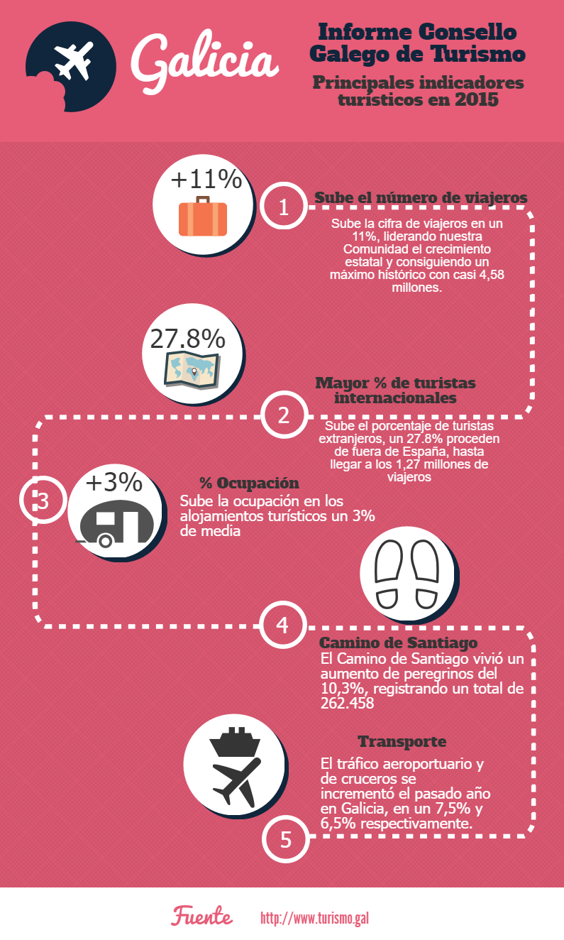 Otro de los indicadores analizados en este informe fue la ocupación que también se vio incrementada en nuestra Comunidad el pasado año consiguiendo los hoteles un crecimiento superior a los 3 puntos porcentuales. En el ámbito concreto del Camino de Santiago se observó en 2015 un incremento de peregrinos del 10,3%, registrando un total de 262.458. Asimismo, también el tráfico aeroportuario y de cruceros se incrementó el pasado año en Galicia, en un 7,5% y 6,5% respectivamente.