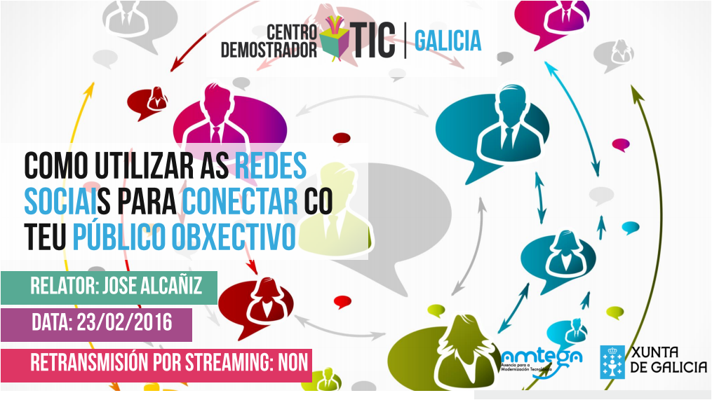 Impartida por CMO do ecommerce de tecnoloxía Quipup.com e CEO de Esterea Comunicación Digital, fundada en 2011, José Alcañiz, que é tamén profesor asociado na Escola de Negocios Afundación, a xornada tocará conceptos como o márketing de atracción, publicación e organización de contidos, reputación en liña, estatísticas, principais redes sociais e novas redes como Periscope, Snapchat, Vine etc así como ferramentas para a xestión de redes sociais. Podes inscribirte e atopar información da xornada a través deste enlace: https://cdtic.xunta.es/redes-sociais