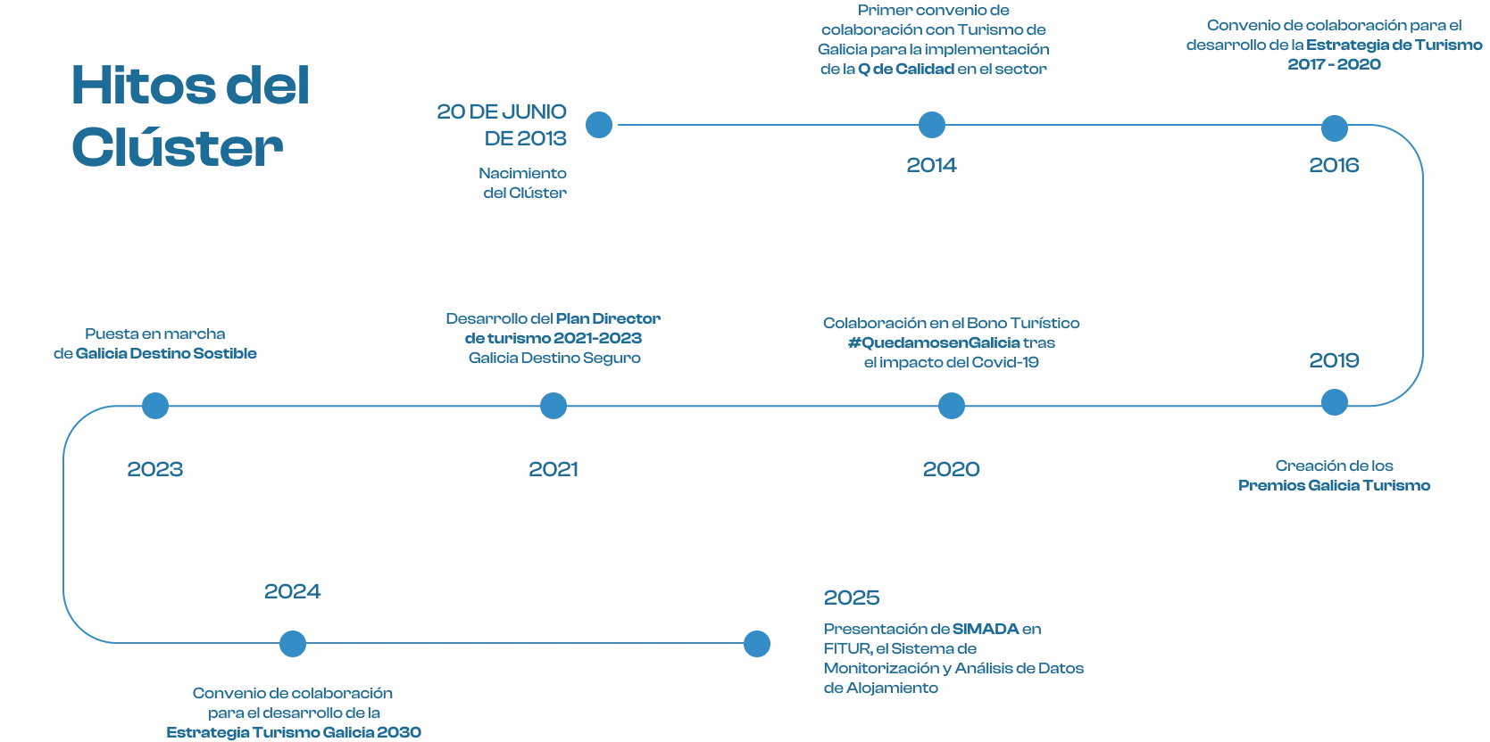 Actualmente, el Clúster de Turismo, constituido en diciembre de 2013, está conformado por 60 entidades que agrupan toda la cadena de valor del sector turístico y que se distribuyen por las cuatro provincias gallegas.