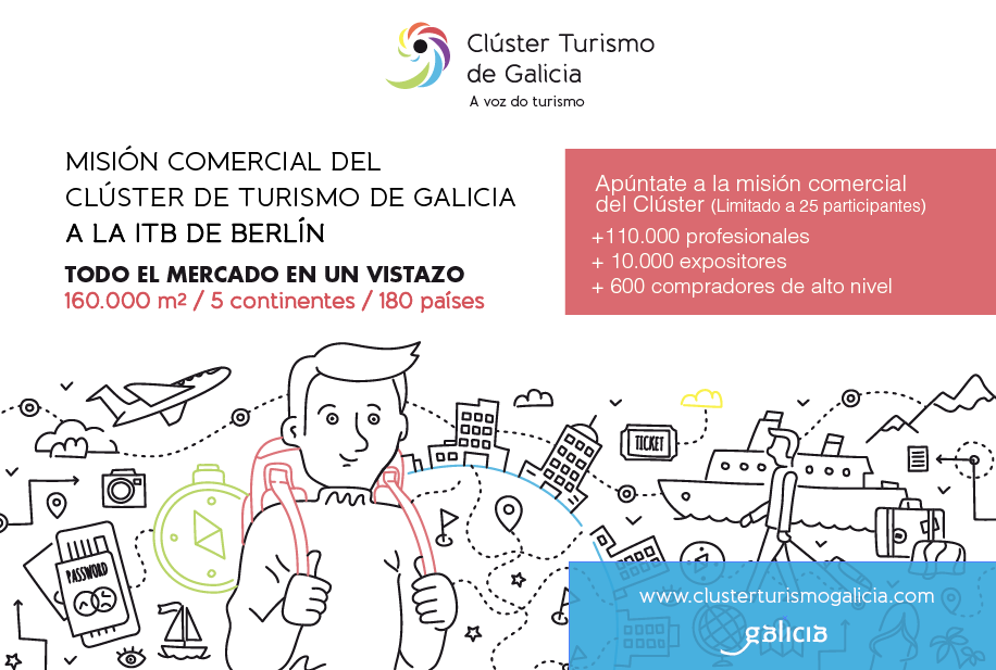 El Clúster de Turismo de Galicia acaba de abrir el plazo de inscripción para que aquellas empresas asociadas al CTG que lo deseen se unan a la misión comercial que se está organizando para participar en la ITB Berlin, considerada ya la feria internacional del sector turístico más importante del mundo. La misión se desarrollará … Leer más